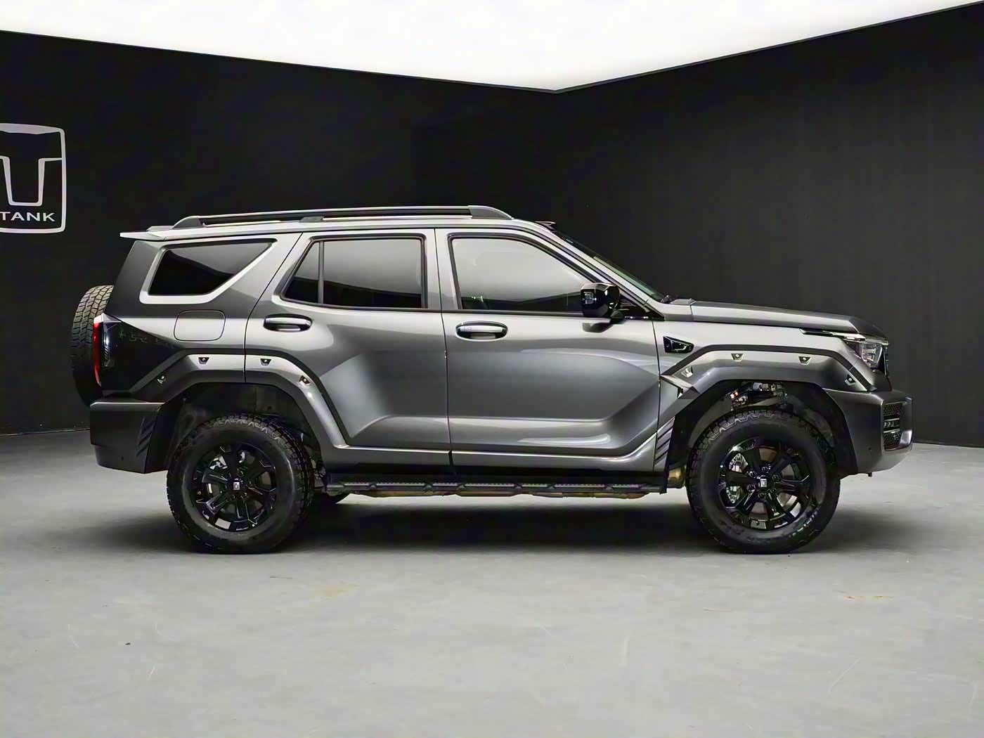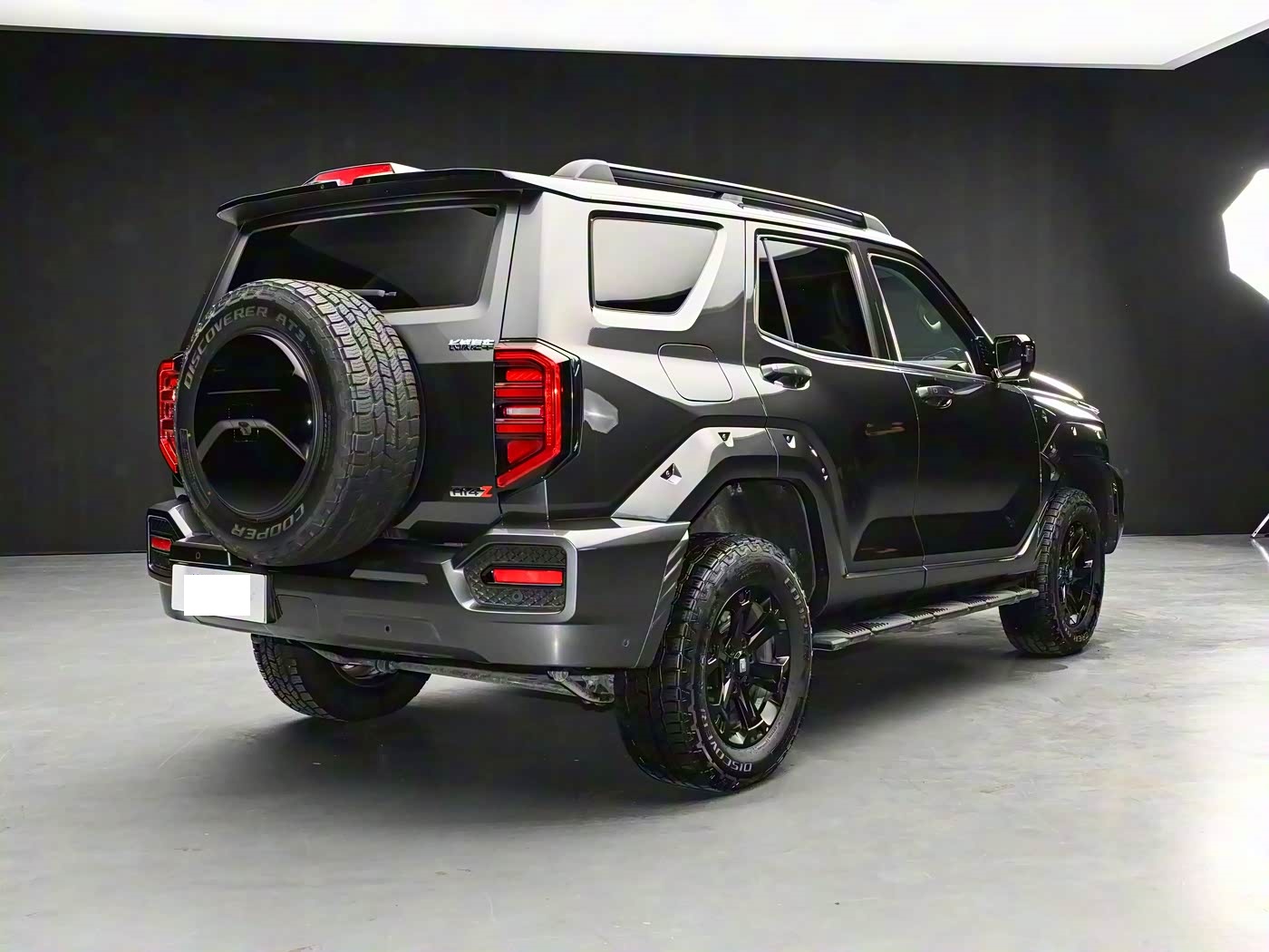 再来看车身侧面部分,新车的车身侧面以平直腰线为主,搭配悬浮式车顶设计和18英寸多辐轮毂(高配车型升级为20英寸),营造出强烈的运动感。尺寸方面,新车长宽高为4985/1960/1900毫米,轴距2850毫米,接近角33°,离去角30°,最小离地间隙224毫米,通过性表现出色。车顶行李架、侧踏板及外挂式备胎等配置,进一步强化了越野属性。隐藏式门把手的设计,既提升了科技感,又优化了风阻系数。