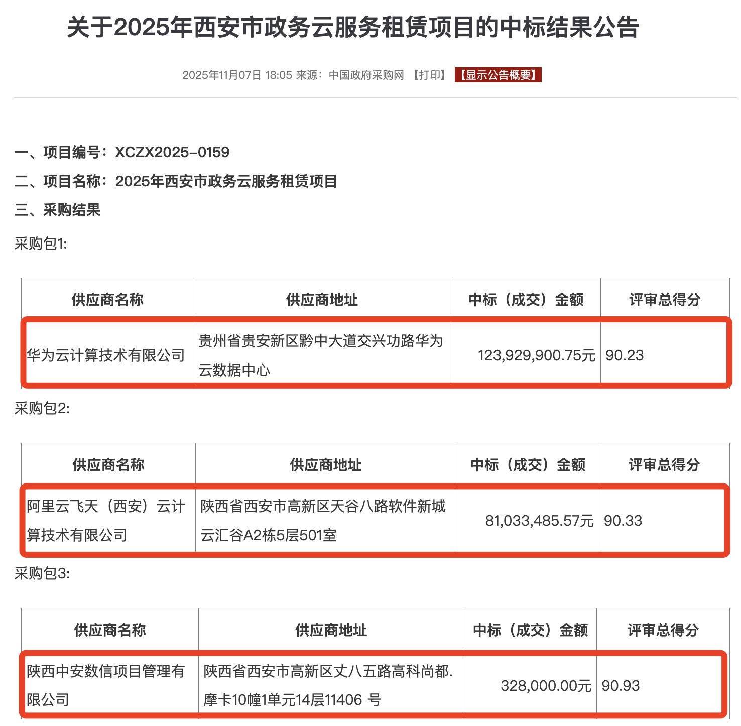 智东西11月7日报道,今日晚间,西安市数据局发布关于“2025年西安市政务云服务租赁项目”的中标结果公告,两大云计算巨头华为云和阿里云都竞得了部分项目,项目金额分别为1.2亿元、8103万元。