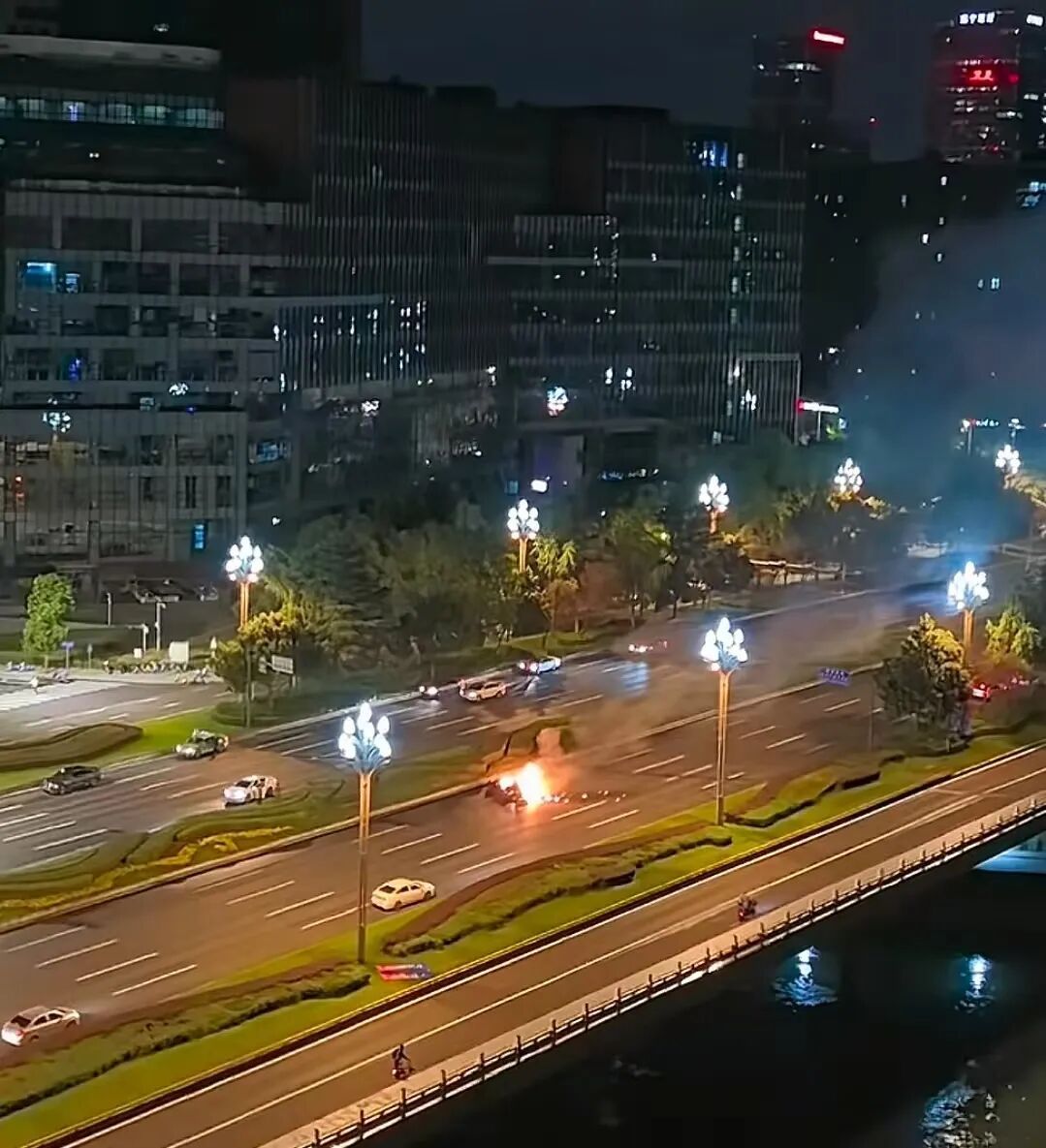 该目击者称其从楼上住户和被追尾的网约车司机处得知,疑似该黑色小车车主超速比较快追尾了一台网约车,“然后方向打大了,从绿化带直接飞到对向车道。”